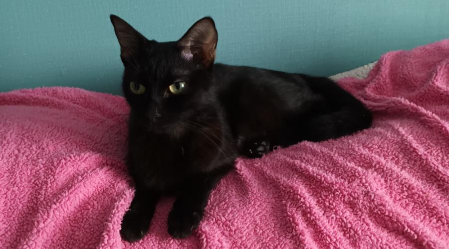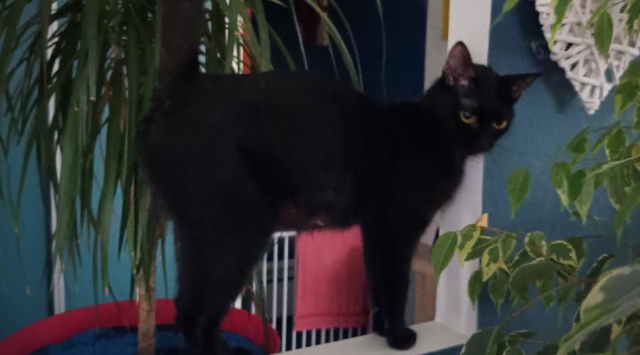 Altesse est en famille d'accueil pour finir d'élever ses chatons. Elle est très sociable, câline. Elle vient sur les bras, se couche, adore les caresses et s'entend avec les chiens et chats : une perle noire.