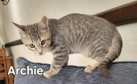Archie est le seul mâle de la portée. A cause de soucis de santé passés, il garde une petite instabilité des pattes arrières. Cela ne l'empêche pas d'être un chaton curieux, joueur, un peu casse cou...